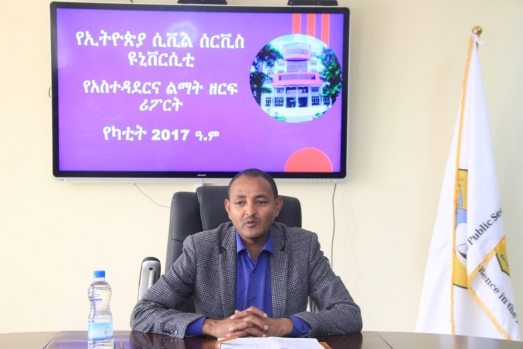 የኢትዮጵያ ሲቪል ሰርቪስ ዩኒቨርሲቲ ፕሬዚዳንት ዶ/ር ንጉሥ ታደሰ ከአስተዳደር ዘርፍና ከማናጅመንት ድጋፍ ሰጪ ዘርፍ ከሚገኙ ሥራ አስፈጻሚዎች ጋር የካቲት 26 ቀን 2017 ዓ.ም በሴኔት አዳራሽ የትውውቅና የውይይት መድረክ አካሄዱ፡፡ በውይይት መድረኩ ላይም የየዘርፉ ኃላፊዎች እያከናወኗቸው ያሉትን ዓበይት ተግባራትና ትኩረት የሚሹ ጉዳዮችን ለፕሬዚደንቱ አቅርበዋል፡፡