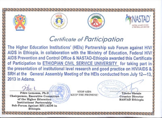 At the third annual general assembly of Higher Education Institutions’ Partnership Forum against HIV AIDS/ SRH (Sexual and Reproductive Health) in Ethiopia, a forum established in 2010 by 74 government and private higher education institutions, ECSU was awarded for its good practices of institutional response and for its contribution to the public sector related to HIV and AIDS Programmess. The university has been awarded for strategically involving in HIV/AIDS prevention and control activities through mainstreaming gender sensitive and gender responsive initiatives of addressing the issues of HIV/AIDS and reproductive health into its core and support businesses (internal mainstreaming, including its efforts of policy driven curricular integration, trainings in various topics relevant to its internal and external customers, research activities) and external mainstreaming. The external mainstreaming includes among others building the capacities of the public sector and community services.