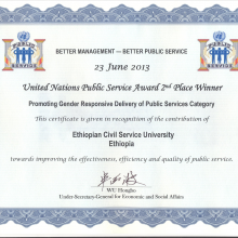 President of ECSU, Dr. Hailemichael Aberra, Head of the ECSU Center for Gender Development, Abay Akemachew, Head of the ECSU HIV and AIDS Management Unit, Philipos Petros, received the certificate awarded to the Ethiopian Civil Service University. In the fifth category, promoting gender responsive delivery of public services, the award was won by three African states. Morocco was a first place winner, Ethiopia and Kenya both became second place winners.